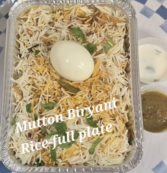 (Overnight marinated mutton layered with basmati rice topped with herbs, fried, onion, saffron and cooked in traditional style.)